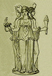 Los monumentos más antiguos conocidos son pequeños y de terracota encontrados en Atenas, con una dedicación a Hécate, en el estilo de escritura del siglo VI. La diosa está sentada en un trono con una guirnalda atada alrededor de su cabeza; está completamente sin atributos ni carácter, y el principal valor histórico de esta obra, que evidentemente es de un tipo bastante general y tiene una mención especial y un nombre simplemente de la inscripción, es que prueba que la forma única es su forma más antigua y que su reconocimiento en Atenas es anterior a la invasión pérsica.